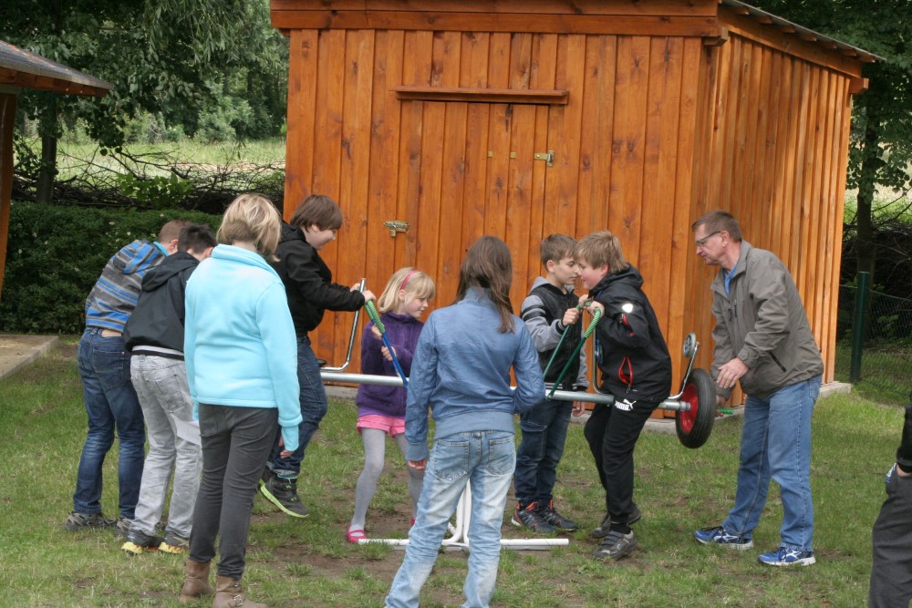Danach ging es dann wieder zurück zur Schule. Dort warteten zuerst eine Auswertung des Schulsportfestes und später ein tolles Programm auf alle Schüler und die künftigen Lernanfänger, welche ebenfalls eingeladen waren. Diesmal wurde das Schiebellfest als Workshop gestaltet. Die Schüler der Klassenstufen 1 bis 6 teilten sich im Vorfeld in gemischte Gruppen. Die Schüler der 5. und 6. Klassen waren als Teamchefs tätig. Ein dickes Lob noch mal an die „Großen“. Sie haben dies ganz toll gemeistert. Eltern, Lehrer und Praktikanten fungierten als Stationsbetreuer und boten den Kindern die vielfältigsten Beschäftigungen an. Alle Gruppen hatten die angebotenen Stationen zu durchlaufen.